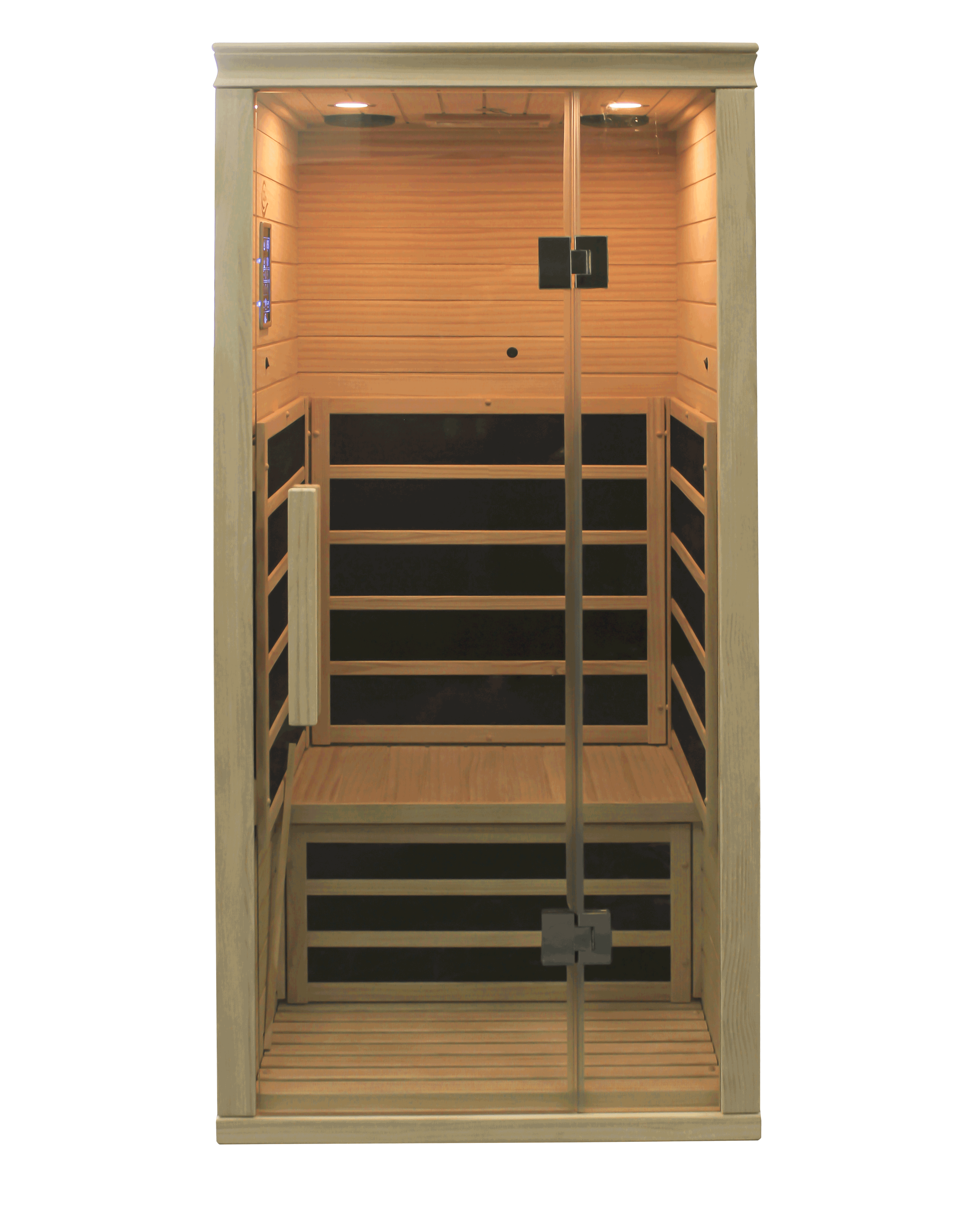 A 8 mm vastag fekete edzett üveg minimális hőveszteséget és a prémium szauna kifinomult megjelenését biztosítja.